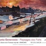 Selon l’artiste « c’est l’émotion que donne la lumière à un moment précis, dans un certain endroit » qui préside au choix du sujet. Attirée par le littoral, l’artiste peintre réalise une première série de monotypes autour de Gravelines en 2018. Puis, invitée en résidence au musée, elle a poursuivi cette suite en 2019 et en 2022. Les remparts et le delta de l’Aa ont particulièrement retenu son attention. A priori austère l’architecture défensive, se charge ici d’une atmosphère mystérieuse. En bord de mer l’empreinte incertaine propre au monotype participe à l’impression de fusion des éléments d’un paysage, toujours mouvant. L’artiste affectionne le moment du crépuscule, entre chien et loup, qu’elle interprète par usage audacieux de la couleur. Le ciel bas se reflète sur les eaux confondues du fleuve et de la mer du Nord.