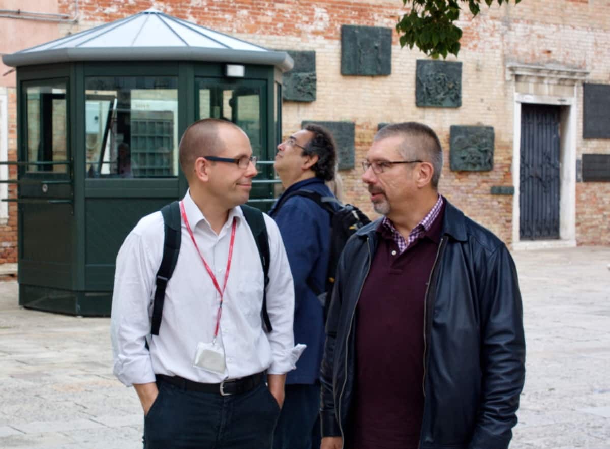 Delegates hanging out in Venice... on the left Frédéric Terrier of Les mille univers (Bourges, France) and on the right Guy Hutsebaut of the Plantin-Moretus Museum (Antwerp, Belgium). While type designer and historian Fred Smeijers (Brussels) admires the architecture.