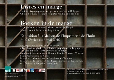 Exposition: Maison de l’Imprimerie de Thuin, Belgique Livres en marge. Editions typographiques et presses privées en Belgique Choix d’œuvres des années quatre-vingt à aujourd’hui Du 9 février au 5 mai 2019 Vernissage le samedi 9 février à 11 h La Maison de l’Imprimerie de Thuin, en collaboration avec Wilfried Onzea, bibliothécaire et collectionneur anversois, présente…