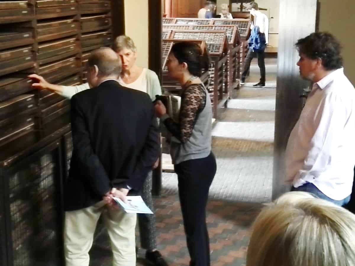 Iris Kockelbergh, curator of the Plantin-Moretus Museum with Eckehardt SchumacherGebler, Offizin Haag-Drugulin (Germany, Zahra Benkass, AMI Atelier-musée de l'imprimerie (France) and Mark Barbour, International Printing Museum (USA)