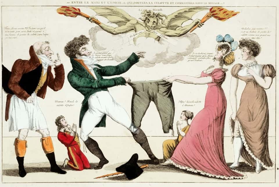 Grande Querelle entre le mari et l'épouse, à qui portera la culotte et commandera dans le ménage (détail), Jean (éditeur), Paris, entre 1797 et 1802, taille-douce coloriée au pochoir, Coll. MuDAAC, dépôt au musée de l’Image, Épinal / © Musée de l’Image - Ville d’Épinal - cliché H. Rouyer