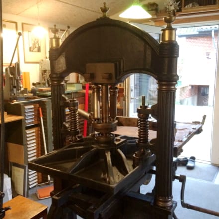 Many of the details are similar to those of Dingler presses but I have not yet been able to find an exact match – and many other details would suggest presses other than Dingler. After a massive search through Google and all the books I have managed to find, I have only found 2-rod torsion presses manufactured by Karl Krause and J. W. Alfs in Leipzig. The only 2-rod torsion from Dingler I have found, is the one at the Officina Bodoni in Verona – but it’s very different from my press.