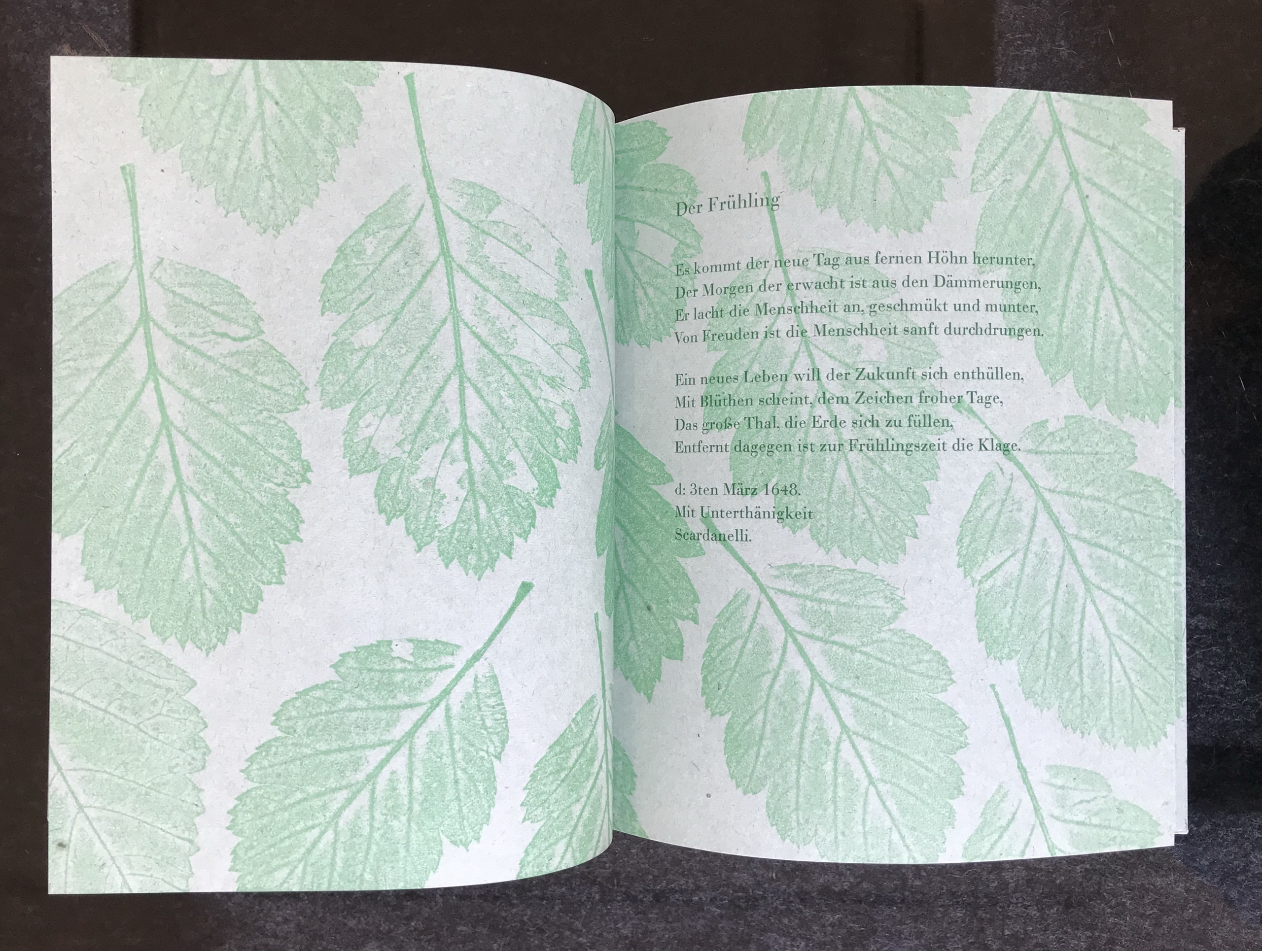 Peter Malutzki writing about his Book Green (Buch Grün) dealing with season poems by Hölderlin: “What especially interested me about Hölderlin’s late season poems was the serial aspect. I wanted that to come through in the nature prints from real tree leaves as well. Throughout the book, four different types of leaves alternate in the same rhythm. Corresponding to the four seasons in Hölderlin’s poems., I used dried leaves from four different trees for the prints. The immediate method of printing directly from the object to be depicted (1:1) brings up the question of what is original and „real“. The concept of the original graphic, which still plays an important role in the book arts, is changing. What fascinates me is printing from original materials, but I have become just as intrigued by working with materials from newspapers, magazines etc., wether by collaging original materials or printing them with polymer plates… (Peter Malutzki, Cat. Buchstäblich Buch, Flörsheim 2017).”