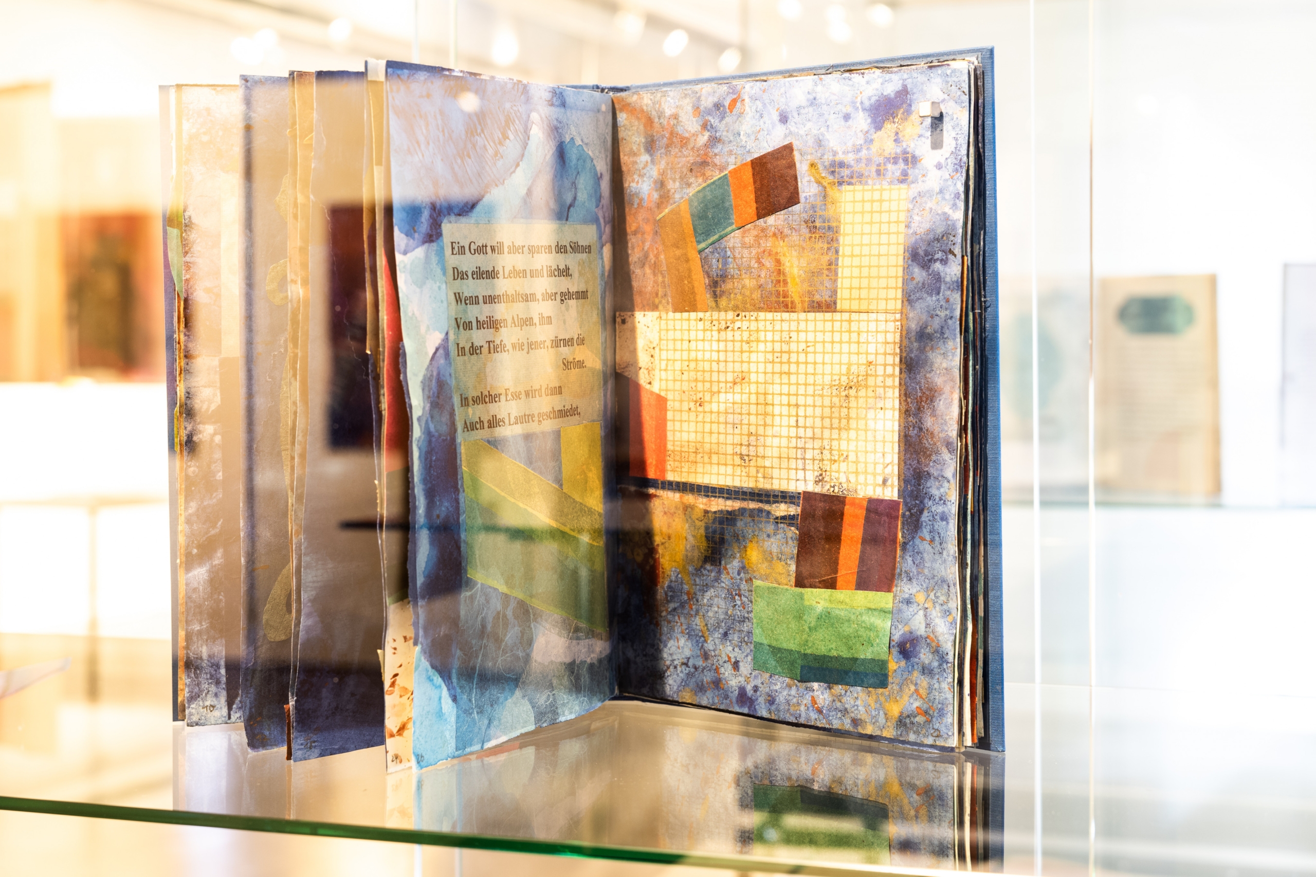 The Klingspor Museum was to be one of the hosts of the 2020 Aepm annual conference. But, as you can imagine, the conference has been cancelled because of the coronavirus outbreak and the Museum is closed to the public until further notice. We had been greatly looking forward to showing you our latest exhibition Wahrlich! es ist Himmelsvorgenuß. Buch- und Schriftkunst zu Friedrich Hölderlin showing book art and calligraphy from the 1930s through to 2010. The exhibition refers to Friedrich Hölderlin who was born 250 years ago. Hölderlin was one of the great figures of the German language. Reaching out to make links between culture, politics and a civilized approach to society, from a position somewhere between German classical and romantic literature, Hölderlin offers us answers to many questions posed in more recent times. Today’s artists continue to be inspired by Hölderlin and to dialogue with his life and poetic works. An engagement which is all the more significant because Hölderlin saw himself as suffering from the indifference of society in much the same way as many artists have felt since his time. With the result that there is considerable resonance among the works shown in the Klingspor Museum’s exhibition.