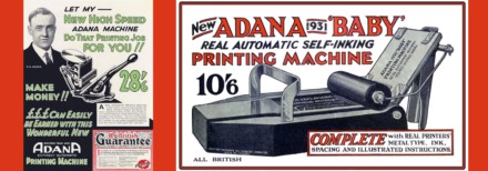 Donald Affleck Aspinall was born in April 1899, served in the Essex Regiment in the Great War and established Adana at the youthful age of just 23. By 1927 he was exporting his presses to the United States and had a worldwide distribution network for his products. The first Adana advertisement appeared on 25th November 1922 in The Bazaar, Exchange & Mart, offering readers a “massively constructed’ press capable of printing everything ‘from a chemist’s label to an illustrated magazine’. In truth it was a simple wooden box with a hinged lid, based upon the Victorian Parlour Press.