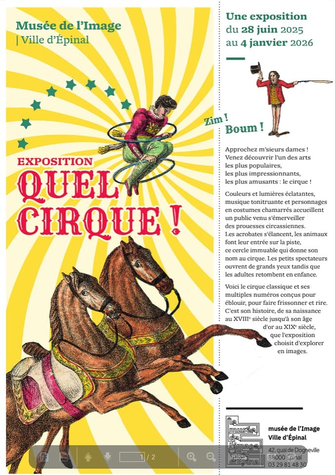Du 28 juin 2025 au 4 janvier 2026, le Musée de l’image entre en piste pour sa nouvelle exposition temporaire Quel cirque ! Il invite tous les publics à venir découvrir l’histoire fascinante de l’un des arts les plus populaires, où magie, grandeur et folie se rencontrent : le cirque !