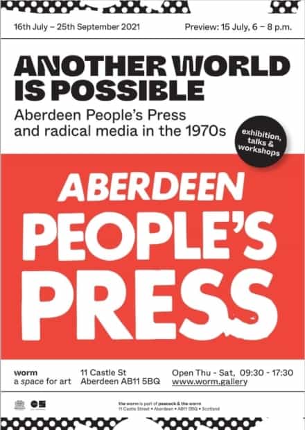 At the other end of Britain, Peacock Visual Arts and the University of Aberdeen Special Collections have approached the subject from a different point of view by organising an exhibition about Scotland’s principal radical press of the period. Another world is possible. Aberdeen People’s Press and radical media in the 1970s provides a glimpse of the extraordinary vivacity of grass-roots activist groups and the possibilities of do-it-yourself citizens’ media nearly forty years before social media grabbed the headlines. Co-curated with formers members of the Aberdeen Peoples’ Press collective (later a workers’ co-op), it draws heavily on the extensive archives of APP which are held in the University’s Special Collections.