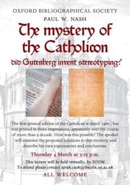 The first printed edition of the Catholicon is dated ‘1460’, but was printed in three impressions, apparently over the course of more than a decade. How was this possible? Paul W. Nash will examine the proposed solutions to this mystery and describe his own experiments and conclusions.