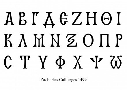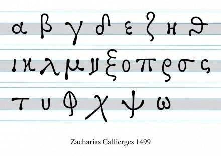 Greek typographic presence dates back to the early decades of the revolutionary invention of printing. Gutenberg conceived and materialized his idea of reusable metal types for text printing when the Gothic hand was the principal choice of the scribes and readers alike in Europe. This, consequently, informed his design choice of the type he used in his first printed Bible. The relative simplicity of the prevailing vertical strokes executed by the pen of the scribe while writing, and their dense positioning next to each other, made easier the conceptualization of the solution and the success of its technical implementation. In effect, printing was born at a historical confluence, when the rising need for multiple copies of any given text merged with the uncomplicated, almost mechanical motion of the prevailing writing style of the era.