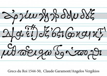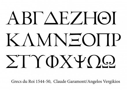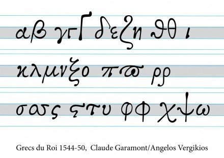In the early decades of the 16th century France became the new center of political dominance in Western Europe and, as the Humanist paradigm and the Renaissance aesthetics spread northwards, Paris was making a serious effort first to emulate, then assimilate and finally surpass the Italian dominance in scholarship and the arts. A pivotal force towards this goal was a dedicated group of Hellenist scholars and master printers: Simon de Colines, Jodocus Badius (Josse Bade), Guillaume Budé, Giles de Gourmont, the Estiennes family, Geoffroy Tory, Claude Garamont and Michel de Vascosan. Tory, the most fervent advocate of Italian Renaissance in France, was instrumental in introducing Aldus’ choices in type, both for the upright Roman, as well as his choice of modeling Greek type after fine contemporary scribes. Concerning the later, when the Royal library needed to reorganize and expand its Greek volumes, Angelos Vergikios, a reknown Cretan scholar and exuberant scribe, was invited from Italy for the job. He collaborated closely with the Estiennes and his exuberant hand writing was chosen as the model for the most celebrated Greek type of the Renaissance. Claude Garamont, a master type-cutter of unparalleled artistry, achieved an astonishing feat in capturing the flamboyant style of the scribe, rendering every nuance and variation in the hundreds of his ligatures with visual rhythm and clarity. The Grecs du roi were cut in two different sizes, in the 1540s, and became the exclusive property of the Imprimerie royal. The punches, matrices and type have survived to this day and still amaze us with their craftsmanship in every detail. There were numerous imitations subsequently throughout Europe and they remained the principal model of any new attempt to cut Greek type until well into the second part of the 18th century, when new artistic ideas and different political and educational priorities led to the abandonment of the Byzantine tradition towards a new path of simplicity.