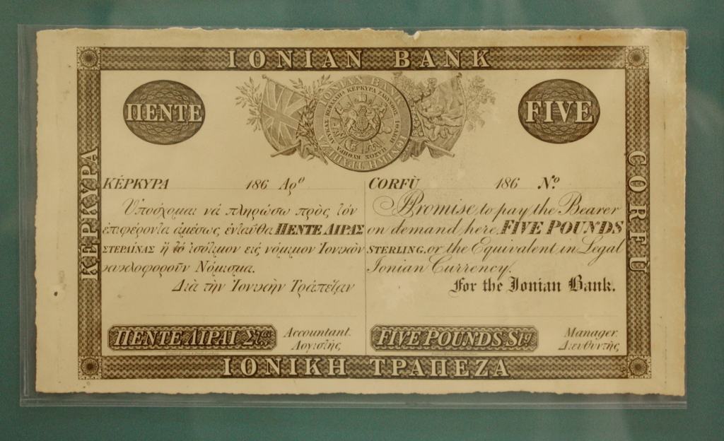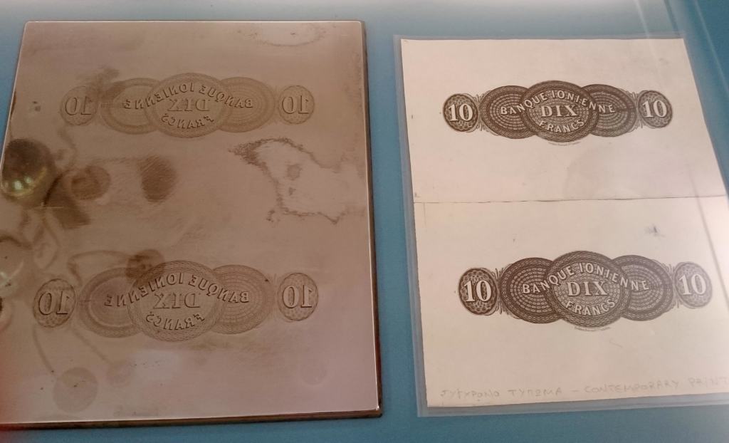 The many items displayed in the Museum include banknotes of all periods, from the earliest days of Greek banking to the present day; early archival documents; engraved intaglio plates, stereotype flongs and relief plates; original artwork and uncut printed sheets of banknotes. Above is a five-pound banknote from the very earliest years of the Ionian Bank, though it is not known whether such notes were ever actually put into circulation. The importance of the British presence in Corfu and in the creation of the Bank is clearly seen in the name of the currency and bilingual Greek-English notes.