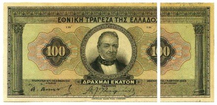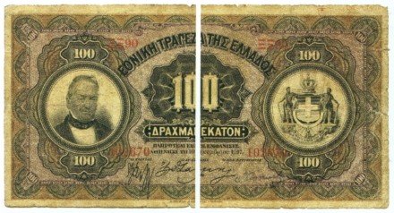 In 1922, after the Balkan Wars, ,the First World War and the catastrophic Asia Minor campaign the Greek economy was in a bad way. To ease its finances, the State borrowed money from the citizens in an original way – by cutting all the banknotes in circulation in two. The half with the bust of the governor of the bank, Georgios Stavros, remained in the possession of the holder and the other half was exchanged for twenty-five year treasury bonds with an annual interest rate of 6.5%. The operation was repeated in 1926, but this time the State recovered only a quarter of the banknotes.