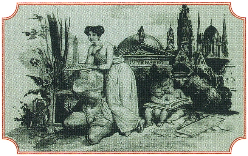 Letterhead illustration of the Verein für Kunst und Literatur in Mainz (1831) as reproduced on the membership card of the International Gutenberg Gesellschaft in 2017.