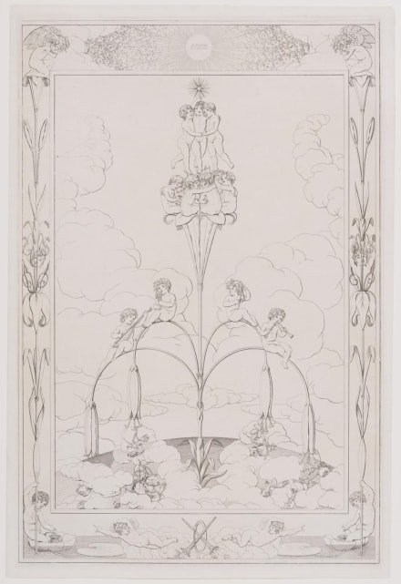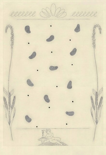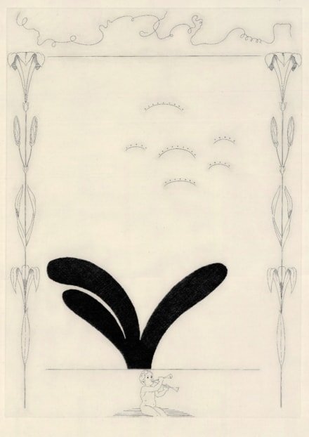 His Essay on Runge series adapts the old master’s dichotomy between frame and center. Yet whereas Runge remains recognizable in the framework of each of the four prints, the central images are entirely Würth’s own. The one exception here is the bold motif of a three-fingered plant that derives from David Hockney’s 1964 painting Man in shower in Beverly Hills (Tate Modern, London). Reminiscent of backlight silhouettes caused by the rising sun, the plant offered itself as metaphor for Morning, the first of the four prints, and enabled Würth to ultimately break away from the hold Runge’s imagery had over him. Only then was he able to organize the interior compositions in his very own visual language.