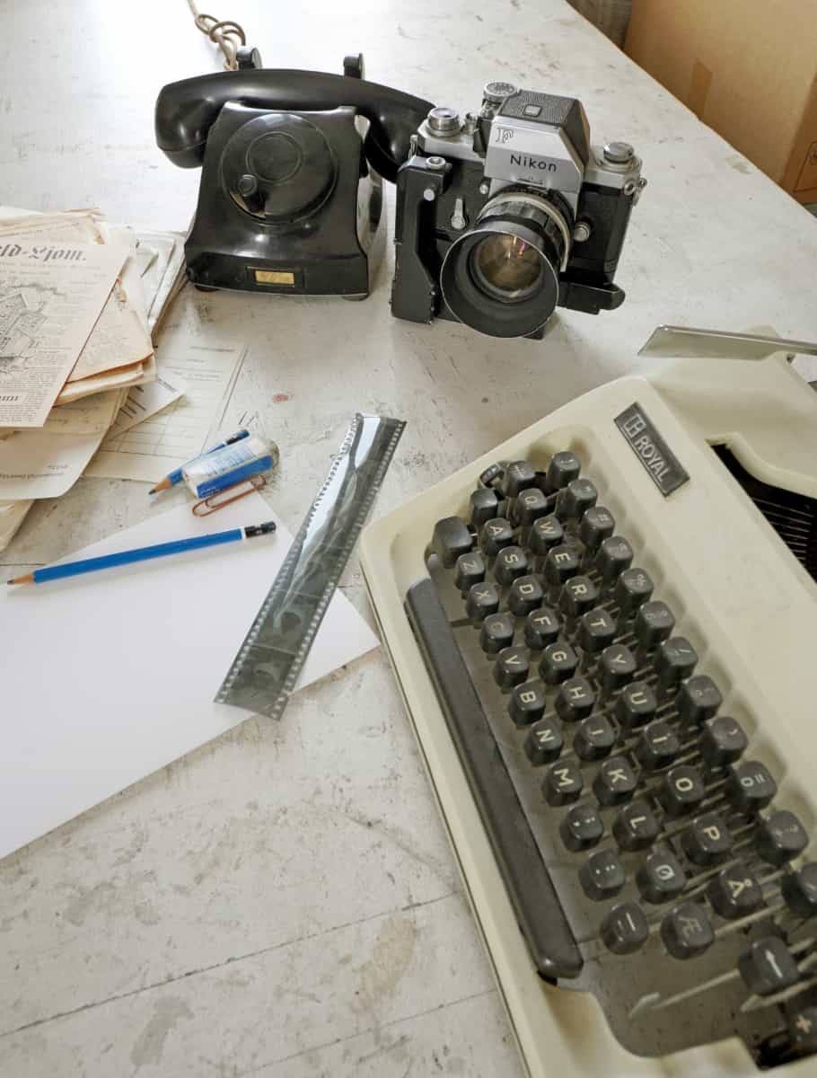 Content making, the old analogue way, with telephone, film-based camera and a manual type writer. All to bee seen and demonstrated in the Press Museum Fjeld-Ljom, Røros, Norway.