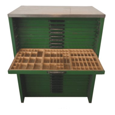 Hamilton Printer’s type setting cabinet. Steel case with solid wood dividers inside the drawers.